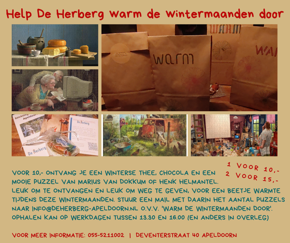 Sponsort U ook de Herberg als tegemoetkoming voor de stookkosten? Ondanks de stijgende prijzen willen we de huiskamer op een goede temperatuur houden zodat iedereen de mogelijkheid heeft om op te warmen. In ruil voor de bijdrage ontvangt u een ‘winters’ pakket met thee, chocola en een puzzel in cadeauverpakking, om zelf te houden of weg te geven. Eén pakket kost € 10,–, twee pakketten zijn € 15,–